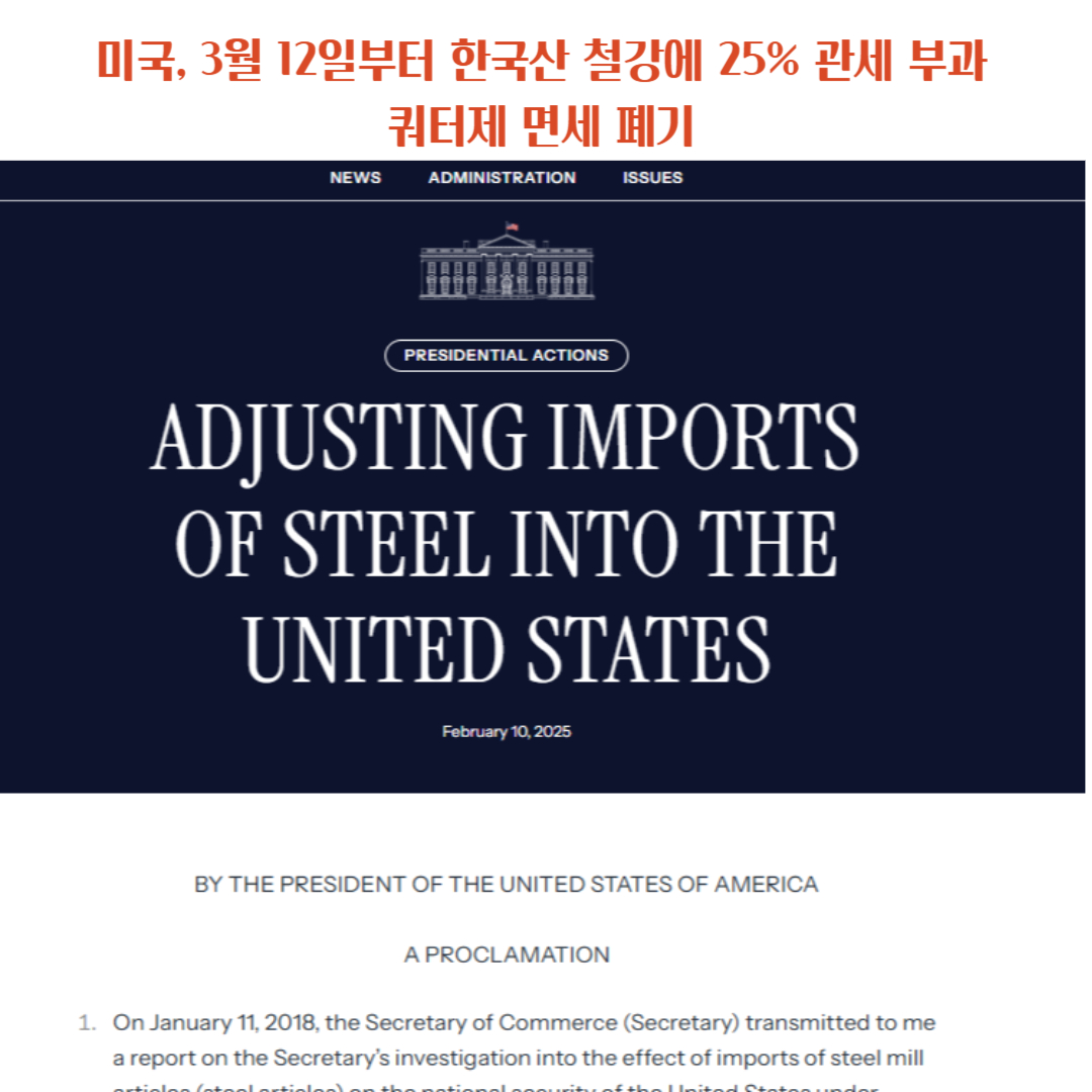 도널드 트럼프 미국 대통령이 2월 10일(현지시간) 서명한 포고문에 따라 오는 3월 12일부터 한국을 포함한 주요국의 철강과 알루미늄 제품에 25%의 관세가 부과됩니다. 이번 조치는 기존 쿼터제에 따른 면세 혜택이 폐기되면서 한국 철강업계도 큰 타격을 입을 것으로 예상됩니다.