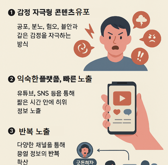 유튜브, SNS, 커뮤니티 등 일상적으로 사용하는 채널을 통해 짧은 시간 안에 허위 정보가 대중에게 노출됩니다. 특히 초기 3~5분 안에 강한 이미지를 각인시키는 전략이 자주 사용됩니다.