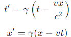 동시성의 상대성에 따르면 두 사건이 한 관측자에게는 동시에 발생하는 것처럼 보일 수 있지만, 다른 관측자에게는 서로 다른 시간에 발생하는 것으로 관측될 수 있는 현상으로 관측자의 상대적인 운동 상태에 따라 시간의 경과가 달라지기 때문에 발생합니다. 수식으로 설명하기 위해 로렌츠 변환을 사용할 수 있습니다. 로렌츠 변환은 시간과 공간의 좌표를 한 관성계에서 다른 관성계로 변환하는 수학적 방정식입니다. 이 변환은 시간과 공간의 좌표가 서로 다른 속도로 움직이는 관찰자 사이에 어떻게 측정량이 변화하는지를 보여 줍니다. 로렌츠 변환은 특수 상대성 이론의 광속 불변의 원리와 상대성 원리를 만족시키도록 고안되었으며 두 사건의 시간과 공간 좌표는 다음과 같이 변환됩니다. 단, 두 관찰자는 좌표계의 x 축으로만 움직입니다.