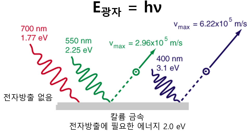 또한 아인슈타인은 광전효과 이론으로 빛이 입자 성질을 가졌다고 주장하였습니다. 1887년에 독일 물리학자 하인리히 헤르츠(Heinrich Hertz)는 자외선 등을 사용하여 금속 표면에 빛을 쏘면 금속 표면에서 전자가 튀어 나오는 현상인 광전효과를 발견하였습니다. 아래 그림에서 빛의 에너지가 2 eV 임계값 이상이면 칼륨 금속 표면에서 전자가 튀어 나오는 현상을 관찰할 수 있습니다. 즉, 빛의 주파수나 강도를 변화시키면 전자의 방출 여부와 에너지가 달라지는 현상이 일어 납니다. 700 nm 빛은 매우 강한 빛을 긴 시간 쬐어도 전자가 방출되지 않느나 550 nm는 극히 약한 빛을 쬐어도 전자를 방출한다. 즉, 빛이 입자로서의 에너지를 전달하는 것을 의미합니다. 파동이라면 계속 에너지를 전달하므로 결국은 튀어 나와야 합니다.