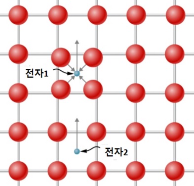 위의 그림에서 두 전자는 전하가 같아 당연히 서로 밀어냅니다. 따라서 서로 끌어당기는 것은 일어나기 어렵지만 실제 발생한다는 것이 쿠퍼 쌍입니다. 두 전자 간의 이러한 상호작용은 위의 그림의 빨간색 원의 구성인 원자 격자에서 전자1이 전자2를 끌어 당기는 인력과 같은 상태가 됩니다. 전자1은 서로 쿨롱 인력으로 인해 양전하인 원자핵을 전자1 쪽으로 약간 움직이며 격자를 지나값니다. 이 때 전자2는 전자1이 만들어 놓은 주변 양전하 밀도가 약간 더 높은 영역으로 당연히 끌어당겨집니다. 즉, 간접적으로 전자1에 끌립니다. 물론 배제 원리에 따라 쿠퍼 쌍의 두 전자는 반대 스핀을 가집니다. BCS 이론은 전자1과 전자2의 한 쌍의 전자라는 쿠퍼의 개념을 결자 내의 모든 자유전자에 적용합니다. 초전도 상태가 되면 모든 전자가 짝이 되고 이를 쿠퍼 쌍이라 합니다. 위의 그림에서 알 수 있듯이 원자 규모에서 쿠퍼 쌍인 전자1과 전자2는 매우 떨어져 있습니다. 이 전자들 사이에는 다른 전자도 있어 이 들도 멀리 떨어진 전자와 쿠퍼 쌍을 이룹니다. 따라서 개별 쿠퍼 쌍의 파동 함수 사이에는 많은 중첩이 존재하여 쿠퍼 쌍의 움직임은 연결된 듯한 관계가 형성됩니다. 군인들이 발맞추어 행진하듯 움직이게 됩니다.