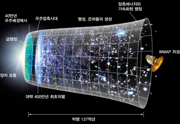 - 우주의 확장 개념은 빅뱅 이론과 연결되어 우주는 약 137억 년 전 매우 뜨겁고 밀도가 높은 상태에서 시작하여 계속 팽창하고 있다는 이론으로 우리 우주를 바라보고 있습니다. 우주 마이크로파 배경(CMB)의 발견으로 빅뱅 이후 우주가 겪은 확장과 냉각의 증거를 제공하고 우주 전역에서 거의 균일한 온도를 보이므로 초기 우주가 매우 균일한 상태에서 시작되었다는 증거가 됩니다. 지구에서 아주 멀리 떨어진 초신성 관측으로도 우주의 확장 속도가 시간에 따라 가속되는 관측 결과입니다.