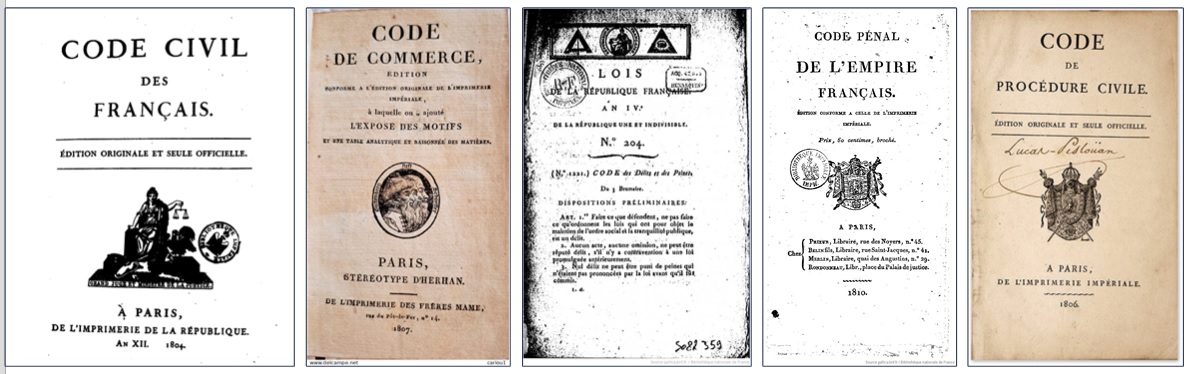 나폴레옹 통치 시기에 제정, 개정된 일련의 주요 법률로 프랑스 법률 체계 현대화 및 통일을 목적으로 도입하여 유럽 전역에 영향을 주었습니다. 나폴레옹 5 법전은 다음과 내용은 아래 표와 같습니다. 특히, 민법전인 나폴레옹 법전은 유럽뿐만 아니라 벨기에, 네덜란드, 이탈리아, 스페인, 포르투갈 등 나폴레옹이 직접 통치하거나 영향을 받은 국가들에 채택되었고 라틴 아메리카의 독립 국가들도 이 법전을 기반으로 자체 법체계를 개발합니다. 프랑스 및 세계 법학의 발전에 중요한 이정표가 되는 법적 유산으로 평가받고 있습니다. 다음은 주요 법전의 내용입니다.