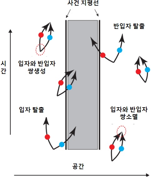 생성된 가상 입자 쌍인 입자와 반입자는 위의 그림처럼 두 가지 운명 중 하나를 맞이하게 됩니다.