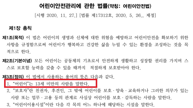 어린이에 대한 대한민국의 정의는 어린이안전관리에 관한 법률(약칭: 어린이안전법)에 따라 다음과 같이 정의한다.
