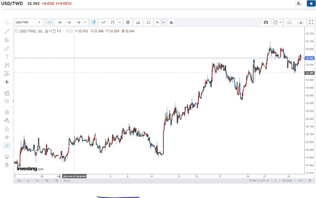 - 환율 변동: 대규모 지진이 발생하면 국가 통화의 안정성에 대한 우려가 커지면서 외환 시장에서 환율 변동성이 증가할 수 있습니다. 예를 들어, 2011년 동일본 대지진 직후 일본 엔화는 단기적으로 가치가 하락했습니다. 이는 해외 투자자들이 일본 경제에 대한 불확실성을 반영하여 엔화 자산을 매도한 결과입니다. 현재 대만도 환율 하락을 경험하고 있으나 일본처럼 회복이 되리라 본다. 아래 그림은 2024년 4월 22일 이전 1개월 간 환율 변동입니다.