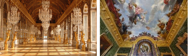 - 특징: 루이 14세의 주도 하에 정교한 정원, 화려한 건물, 수많은 예술 작품으로 장식되었습니다. 궁전의 내부는 루이 르 브랑, 샤를 르 브룬과 같은 당대 최고의 예술가들에 의해 설계되었으며, 벽과 천장은 그리스 로마 신화를 주제로 한 화려한 프레스코화와 조각으로 장식되었습니다.